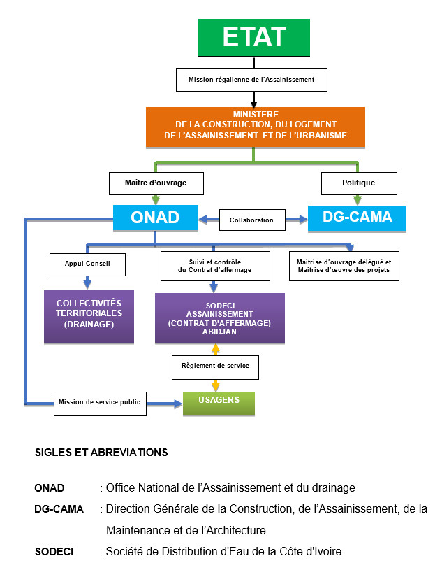 L’Office National de l’Assainissement et du Drainage (ONAD) a pour mission d’assurer l’accès aux installations d’assainissement et de drainage, de manière durable et à des coûts compétitifs, à l’ensemble de la population nationale. L’Office est l’acteur unique national agissant dans le cadre d’une convention de délégation de missions de service public, en matière d’assainissement et de drainage avec l’Etat de la Côte d’Ivoire.
