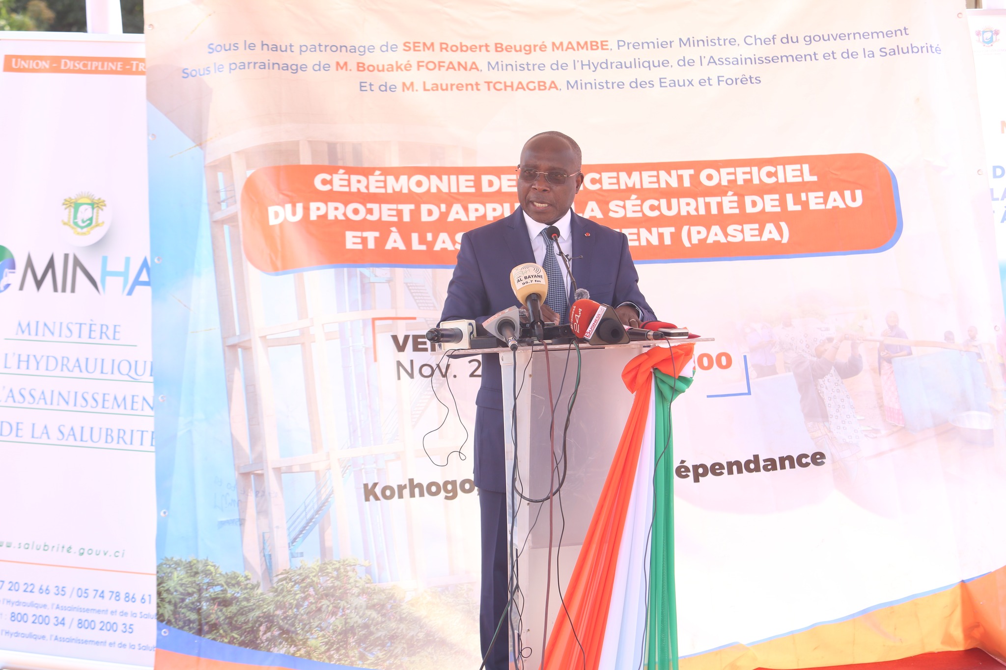 Ministère de l’Hydraulique, de l’Assainissement et de la Salubrité , Représentant le Premier Ministre SEM. Robert Beugré MAMBÉ, a symboliquement donné le top départ des travaux entrant dans le cadre du PASEA. C’était sur la place de l’Indépendance de Korhogo, devant Monsieur Laurent TCHAGBA, Ministre des Eaux et Forêts, Mme Marie-Chantal UWANYILIGIRA, Directrice des Opérations de la Banque Mondiale, ainsi que de nombreux officiels et représentants des populations locales.